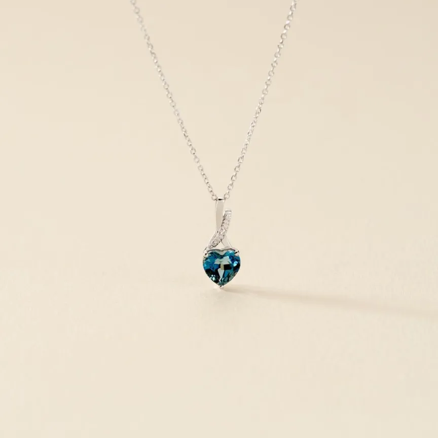 Collier Or Blanc 375/1000 Clothilde Topaze London Blue Forme C艙ur Et Oxydes De Zirconium 42cm