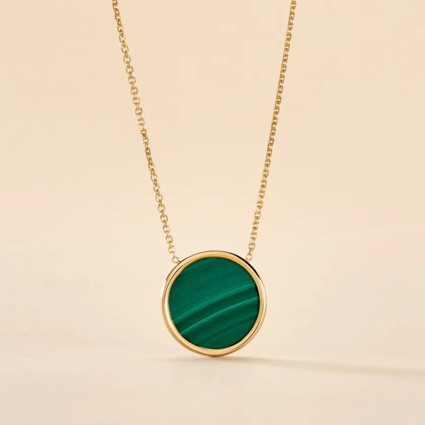 Collier Or Jaune 375/1000 Pastille Malachite Verte Serti Clos 10mm Maille Jaseron 42+3cm