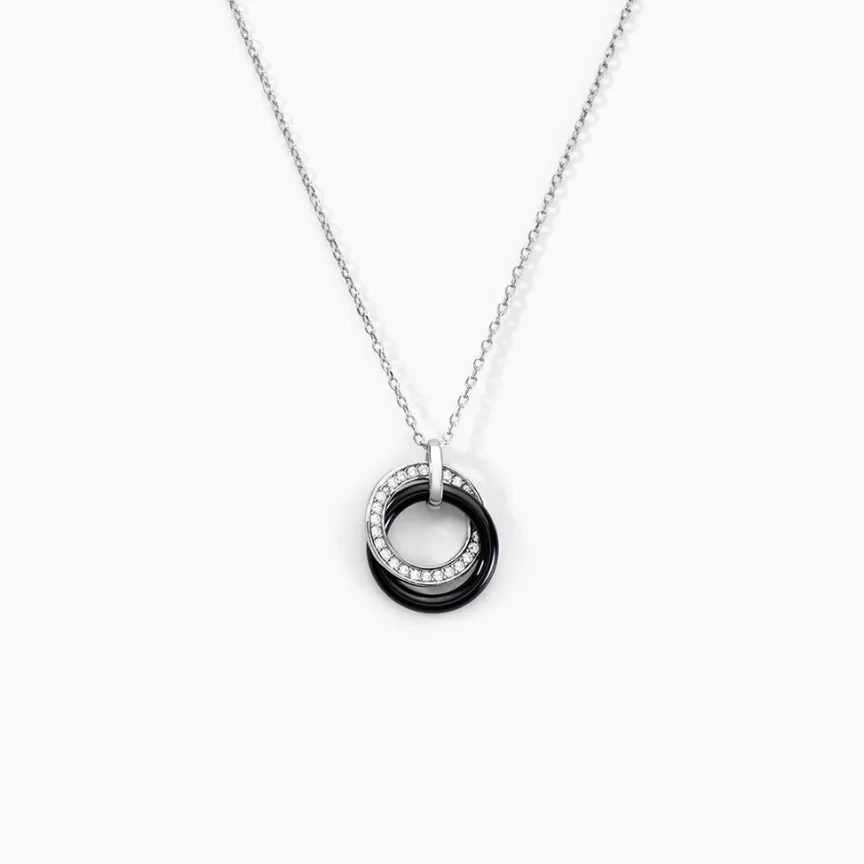 Collier Argent Blanc 925/1000 Cercles Entrelacés Céramique Noire Oxydes De Zirconium Micro Serti Maille Forcat 42+3cm