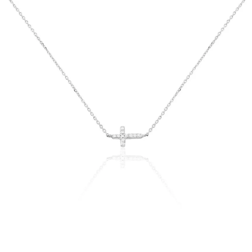 Collier Or Blanc 375/1000 Croix Oxydes De Zirconium Micro Serti Maille Forçat 42cm