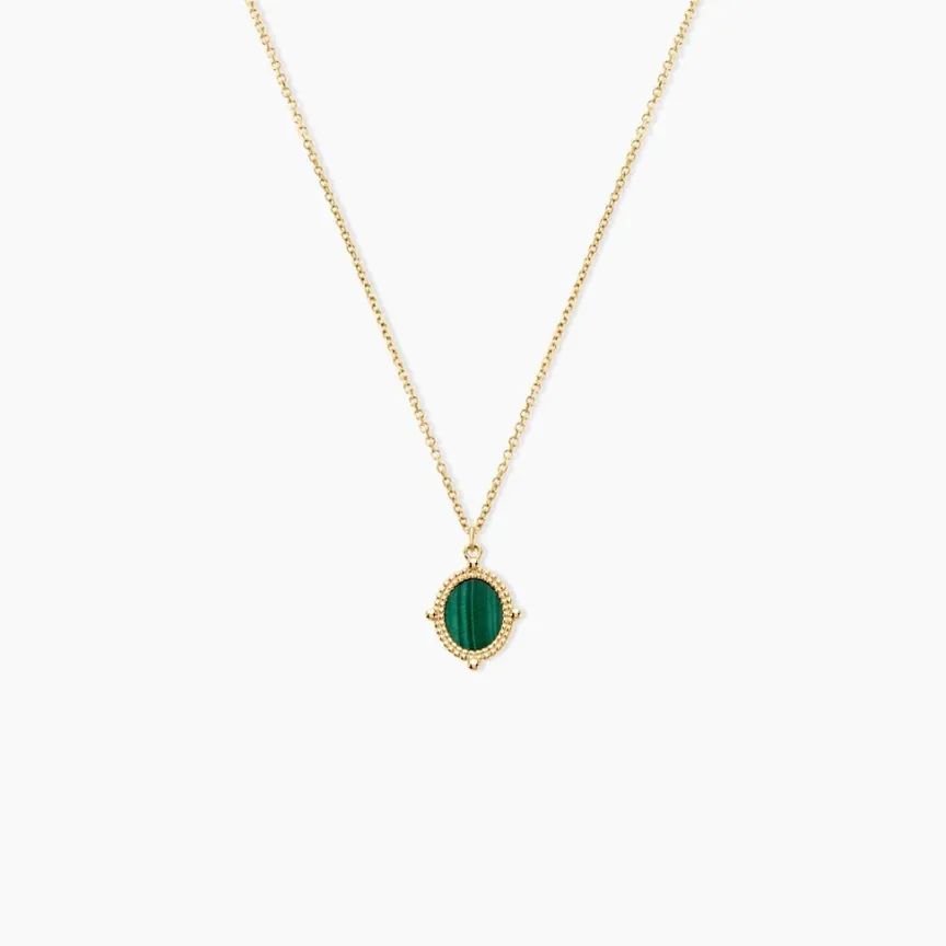 Collier Or Jaune 375/1000 Malachite Ovale Effet Perle Maille Jaseron 40+2cm