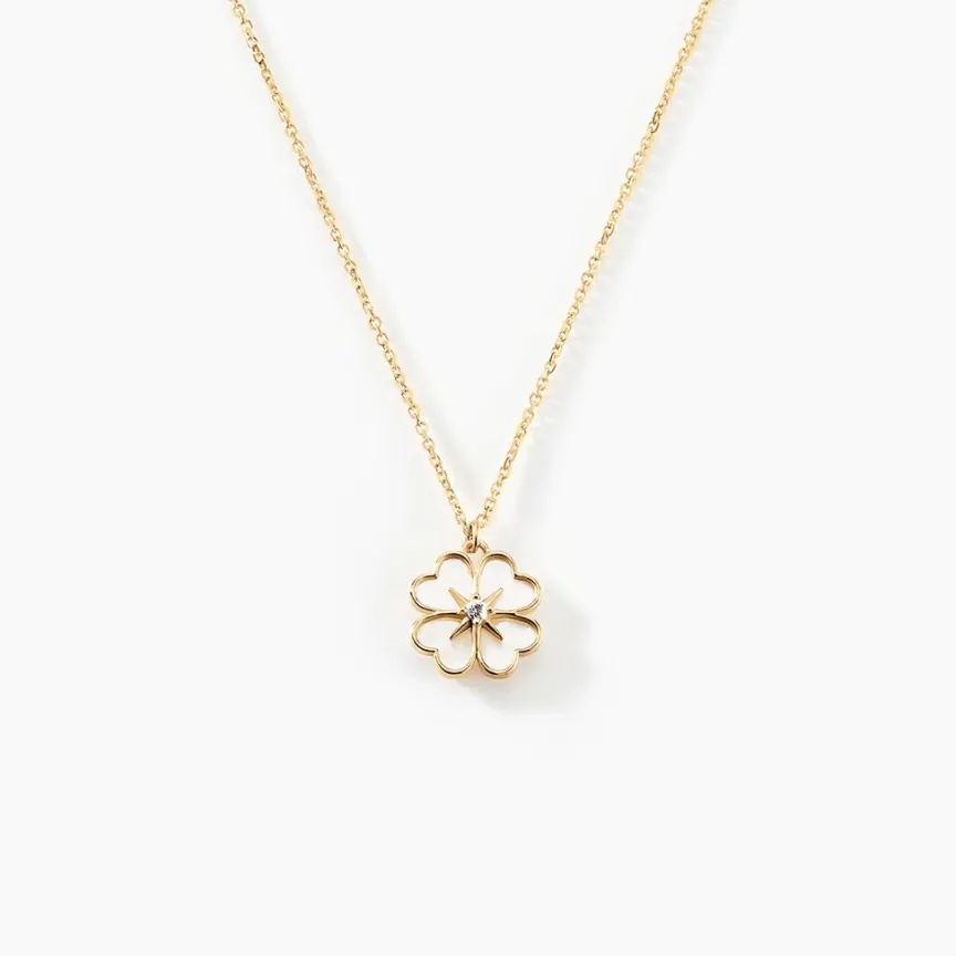 Collier Or Jaune 375/1000 Fleur De Trefle Nacre Blanche 1 Oxyde De Zirconium Serti 4 Griffes Maille Jaseron 40+2cm