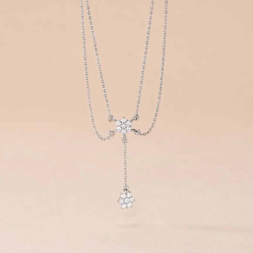 Collier Argent Blanc 925/1000 Double Rang Fleurs Oxydes De Zirconium Serti 4 Griffes Maille Forcat 38+2cm