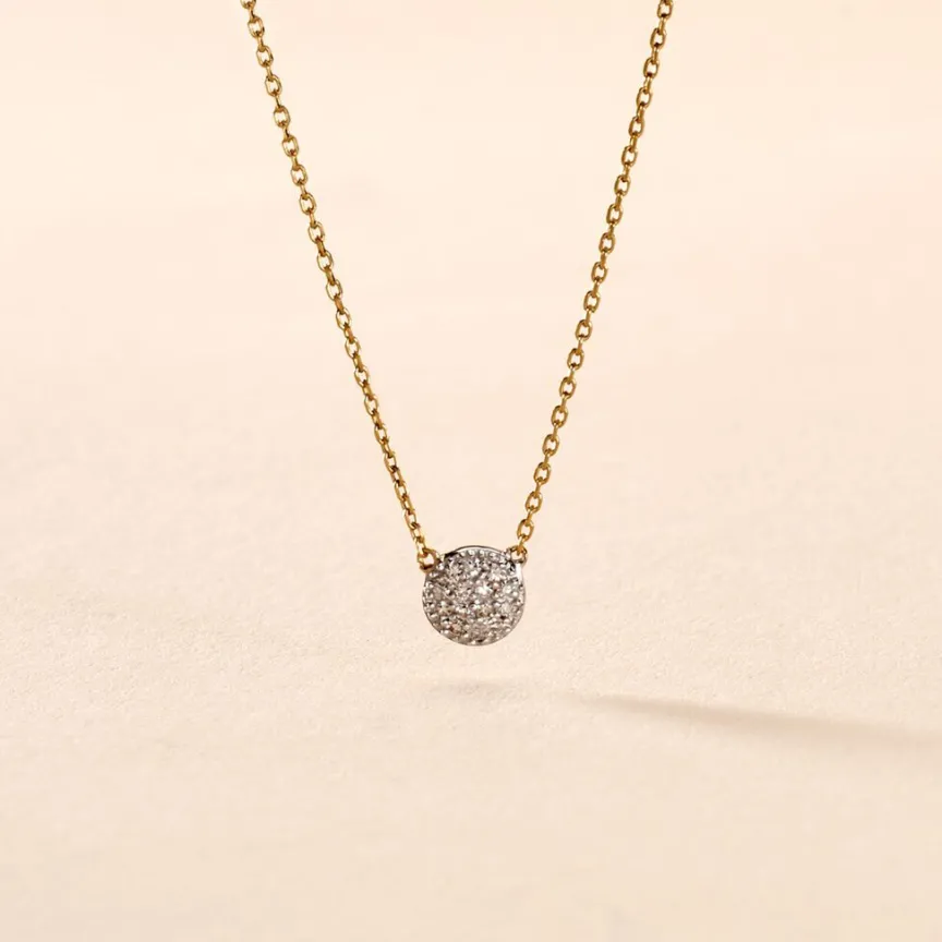Collier Or Jaune 375/1000 Maille Forçat Pendentif Rond Pavage Diamants 42cm
