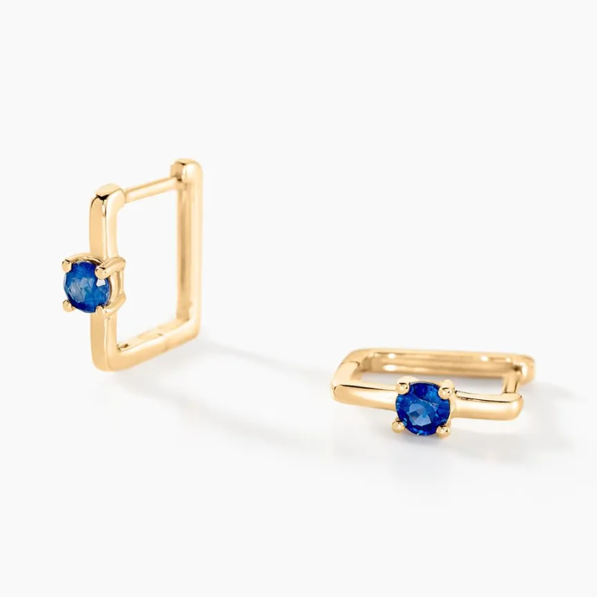 Creoles Or Jaune 375/1000 Carre Avec 1 Saphir Ronde 0.3cts Serti Griffes