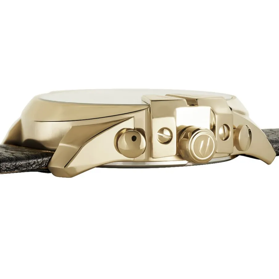 Montre Diesel Mega Chief Acier Dore Ronde Quartz Chronographe 51mm Fond Noir Bracelet Cuir Noir Dz4344
