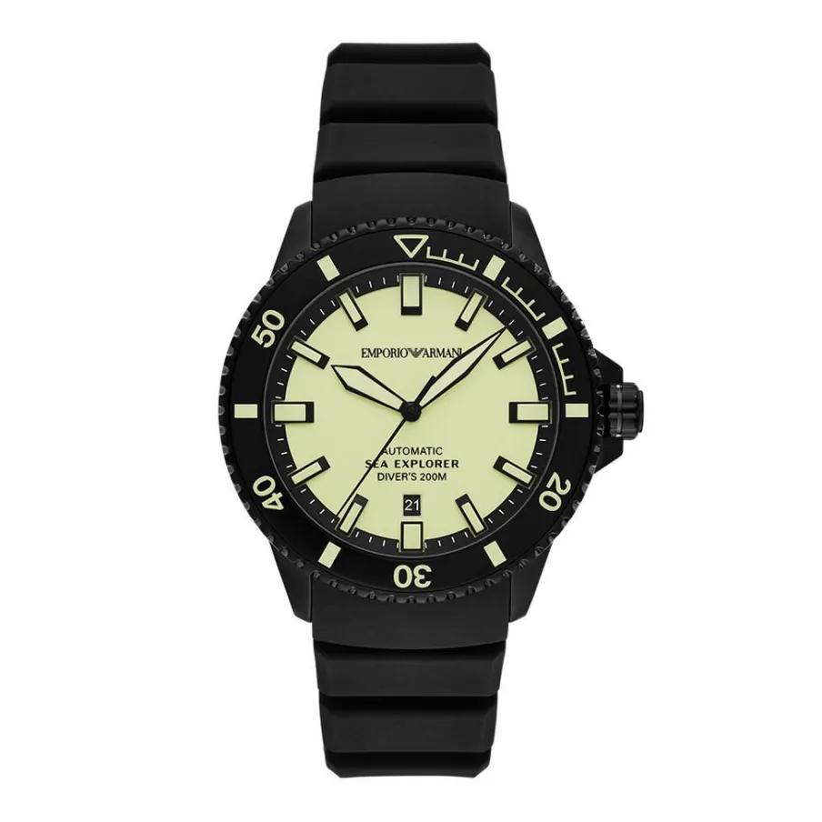 Montre Armani Sea Explorer Acier Noir Ronde Auto 42.5mm Fond Jaune Lunette Tournante Noir Bracelet Silicone Noir Ar60085