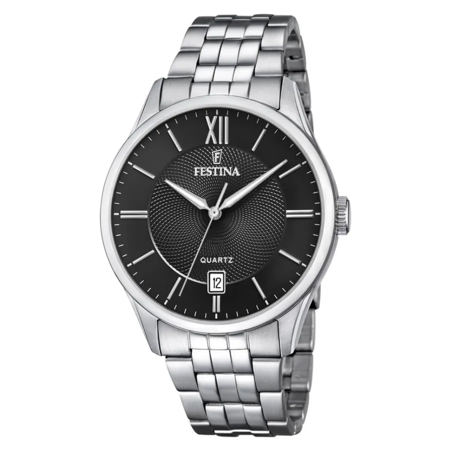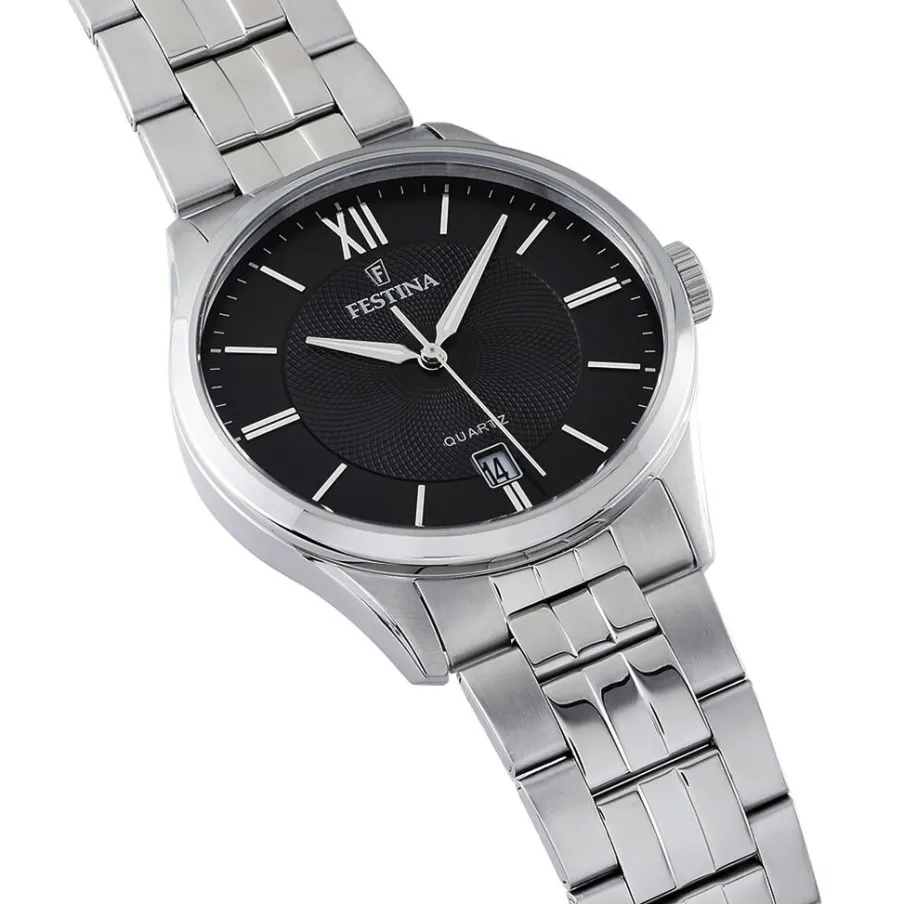 Montre Festina Classics Acier Blanc Ronde Quartz 43mm Fond Noir Bracelet Acier Blanc F204253