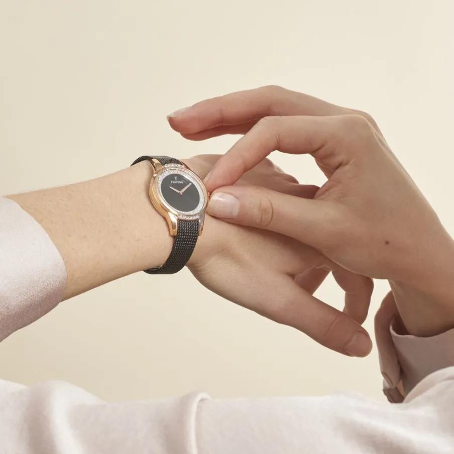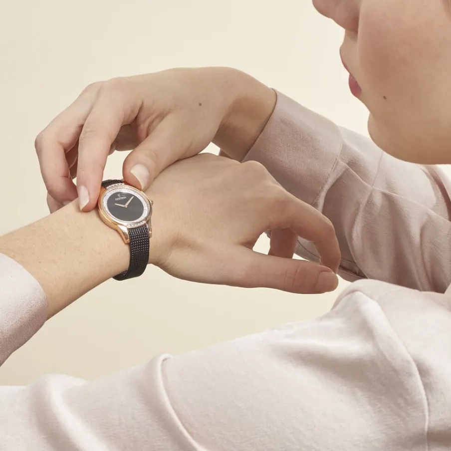 Montre Festina Mademoiselle Acier Dore Rose Ronde Quartz 31mm Fond Noir Et Strass Bracelet Milanais Acier Noir F20496/2