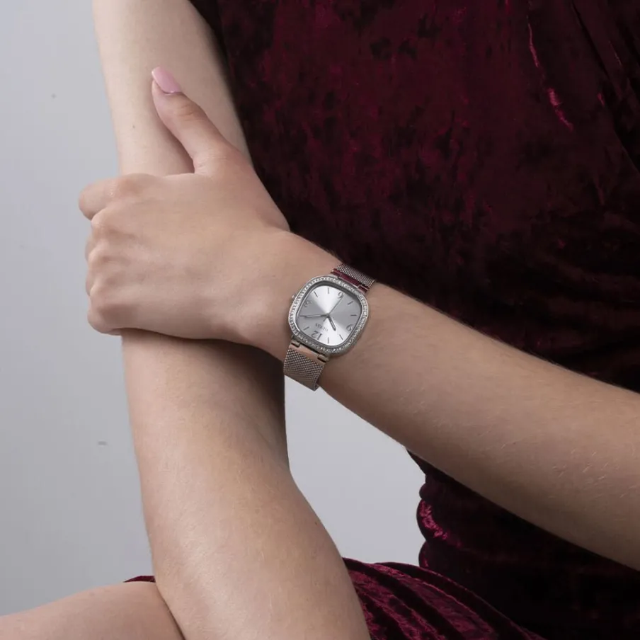 Montre Guess Tapestry Acier Argenté Carrée Quartz 32mm Fond Gris Lunette Strass Bracelet Acier Argenté Maille Milanaise Gw0354l1