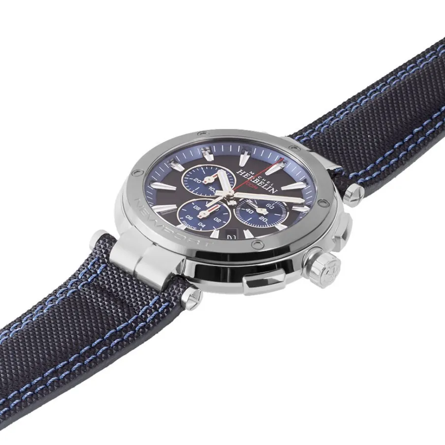 Montre Herbelin Newport Chrono Acier Blanc Ronde Quartz Chronographe 43mm Fond Bicolore Lunette Pvd Noire Bracelet Cuir Noir 37688ag65