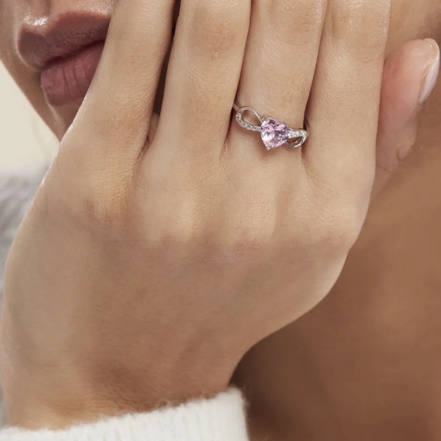 Bague Argent Blanc 925/1000 Coeur Rose Serti Griffes Accompagne Oxydes De Zirconium