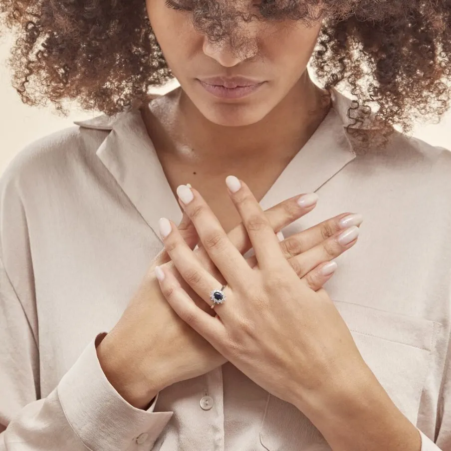 Bague Solitaire Argent Blanc 925/1000 Forme Marguerite Bleue Serti Griffes Entourage Oxydes De Zirconium