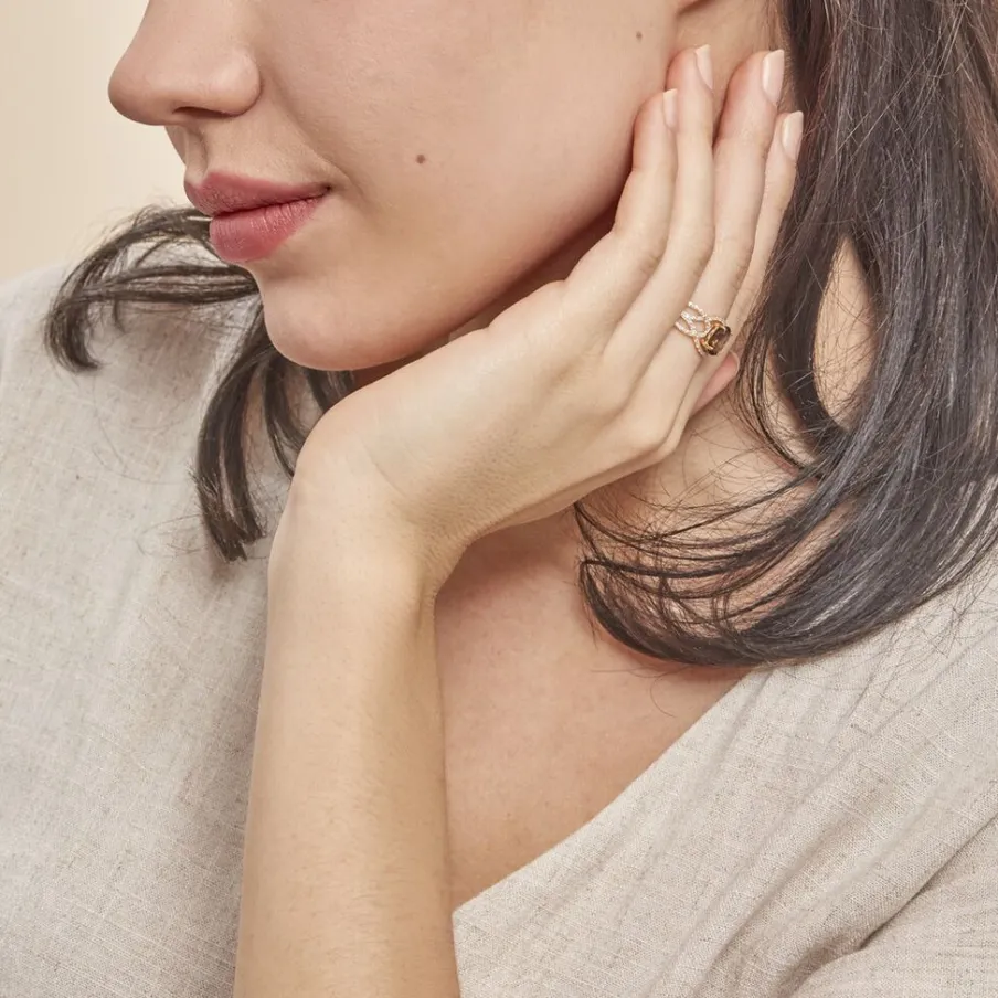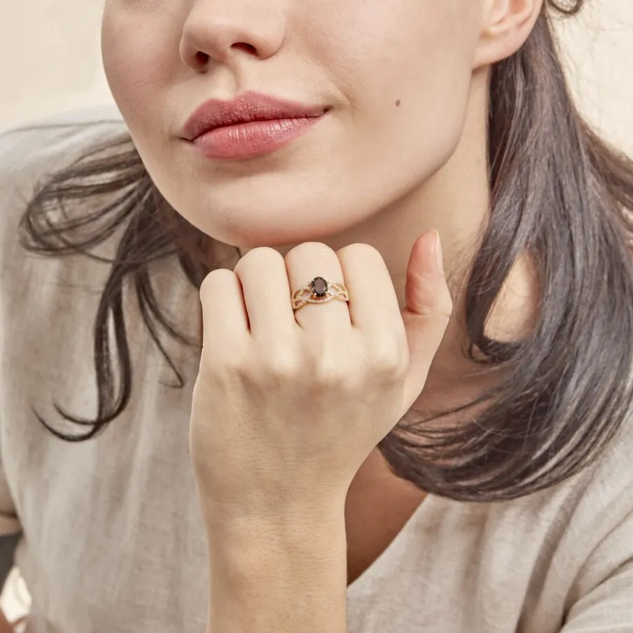 Bague Or Jaune 375/1000 Quartz Fume Central Oval Et Oxydes De Zirconium