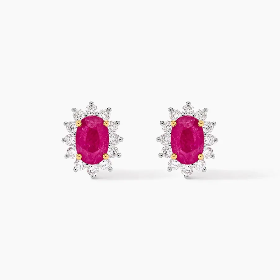 Boucles D’oreilles Or Jaune 375/1000 Rubis Simple Entourage Diamants Pm