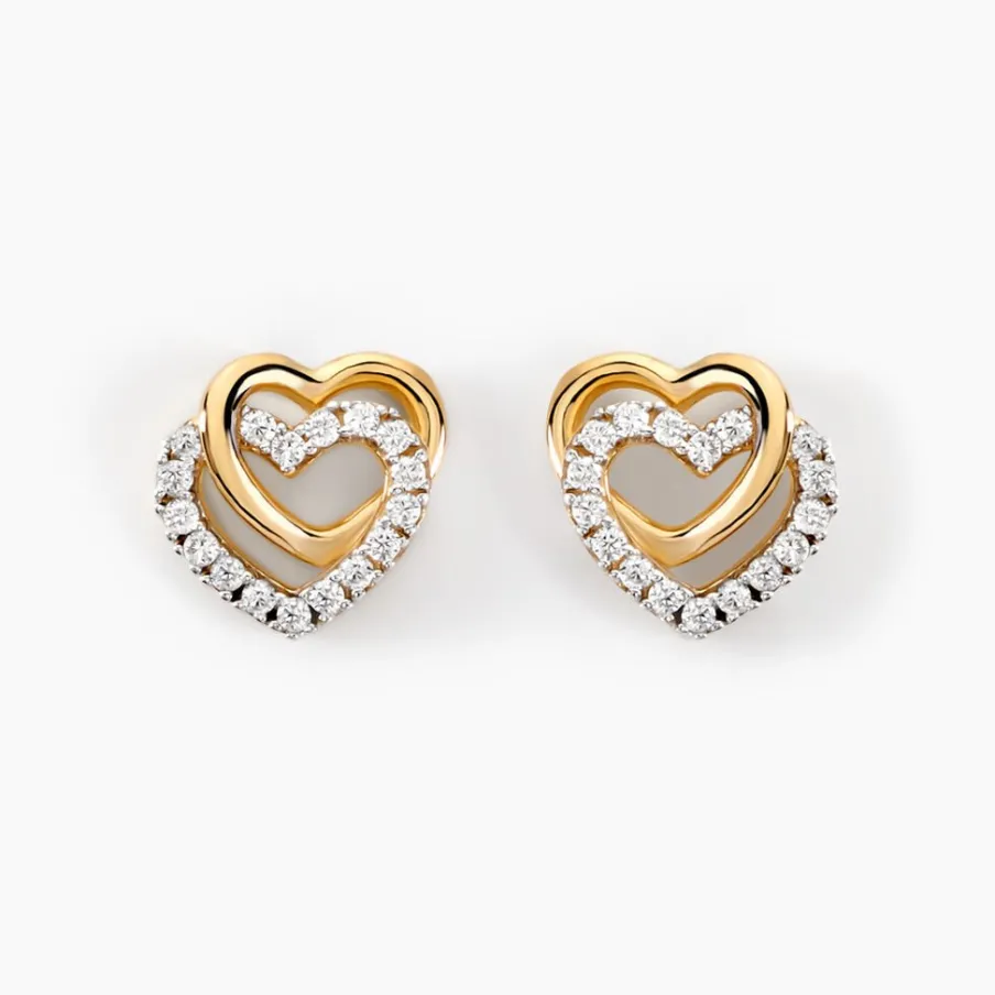 Boucles D’oreilles Puces Or Jaune 375/1000 Double C艙ur Avec C艙ur Pave Oxydes De Zirconium