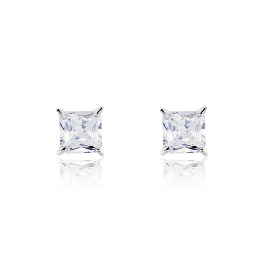 Boucles D’oreilles Puces Argent Blanc 925/1000 Oxyde De Zirconium Carré Serti 4 Griffes 5mm
