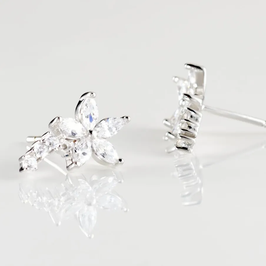 Boucles D’oreilles Puces Argent Blanc 925/1000 Fleurs Sertis Griffes Oxydes De Zirconium Navettes