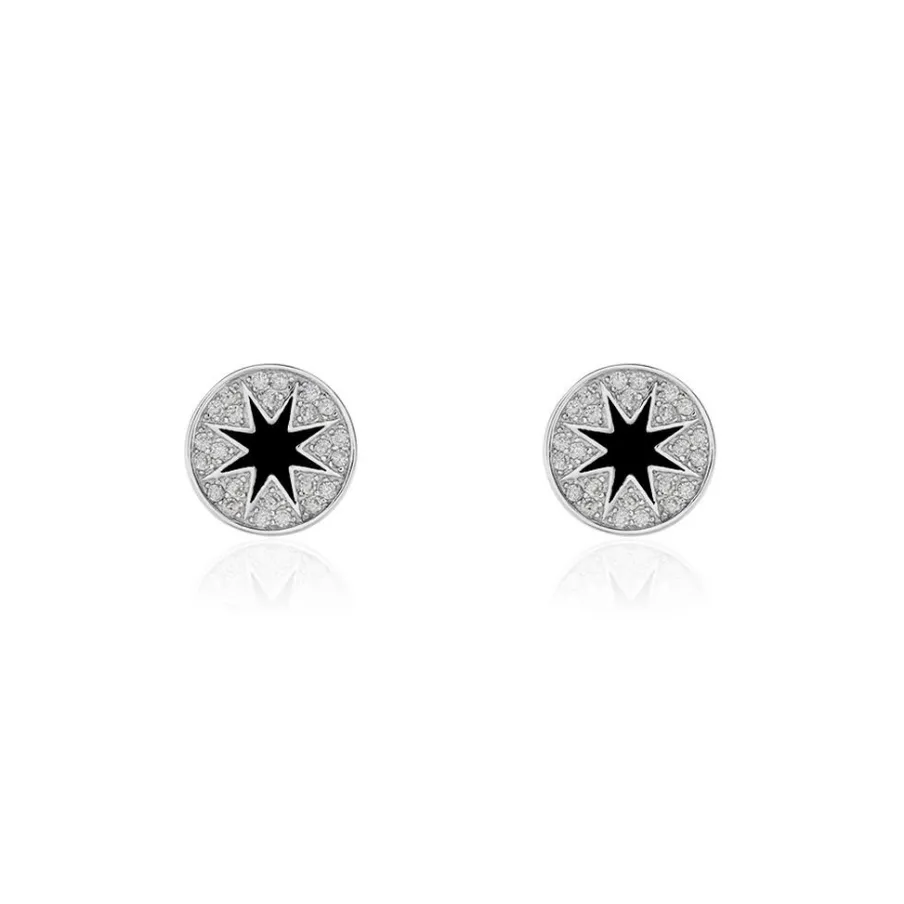 Boucles D’oreilles Puces Argent Blanc 925/1000 Pastilles Etoile Laque Noire Pavage Oxydes De Zirconium