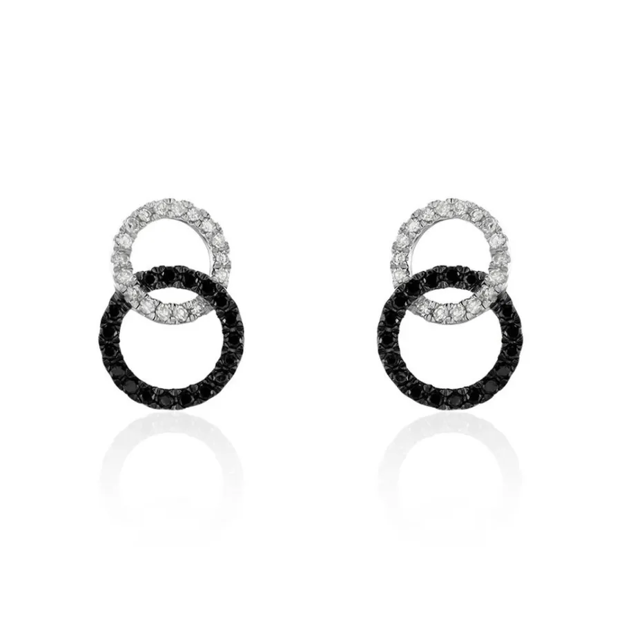 Boucles D’oreilles Puces Or Blanc 375/1000 Toi&moi Cercles Entrelacés Diamants Blancs Et Diamants Noirs