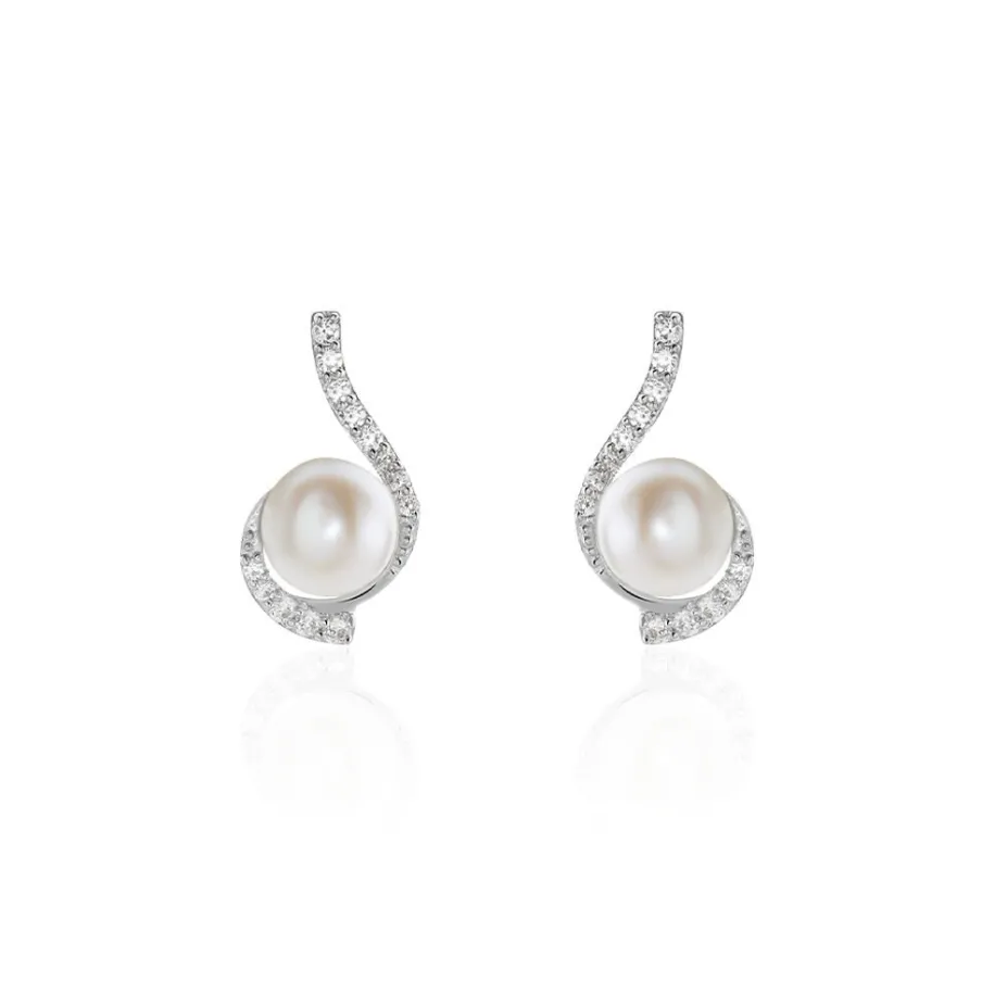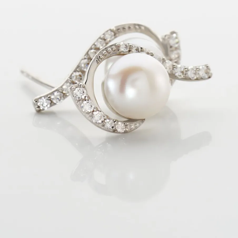 Boucles D’oreilles Or Blanc 375/1000 Perle De Culture 6mm Vrille Oxydes De Zirconium
