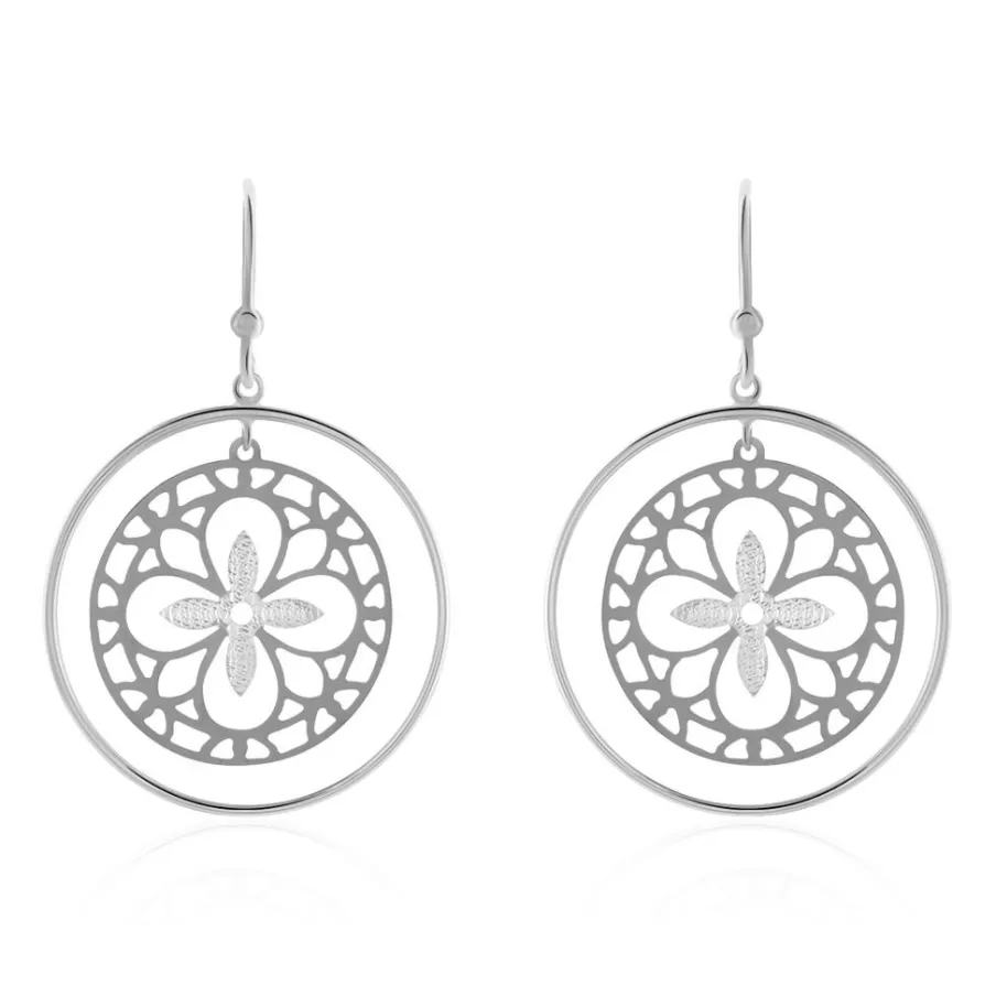 Boucles D’oreilles Pendantes Or Blanc 375/1000 Double Cercles Avec Motif Trefles Ajoures