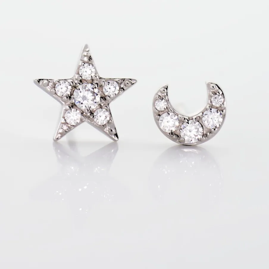 Boucles D’oreilles Or Blanc 375/1000 Puces Motifs Etoile Et Lune Pavages Oxydes De Zirconium
