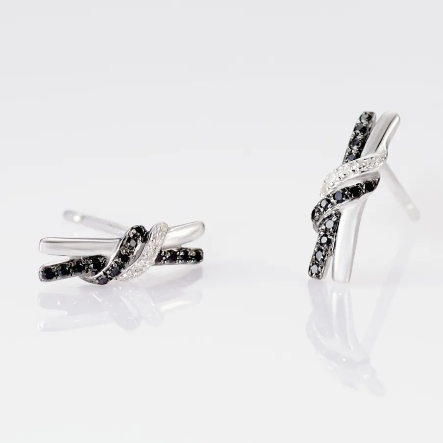 Boucles D’oreilles Or Blanc 375/1000 N艙uds Paves Diamants Blancs Et Diamants Noirs