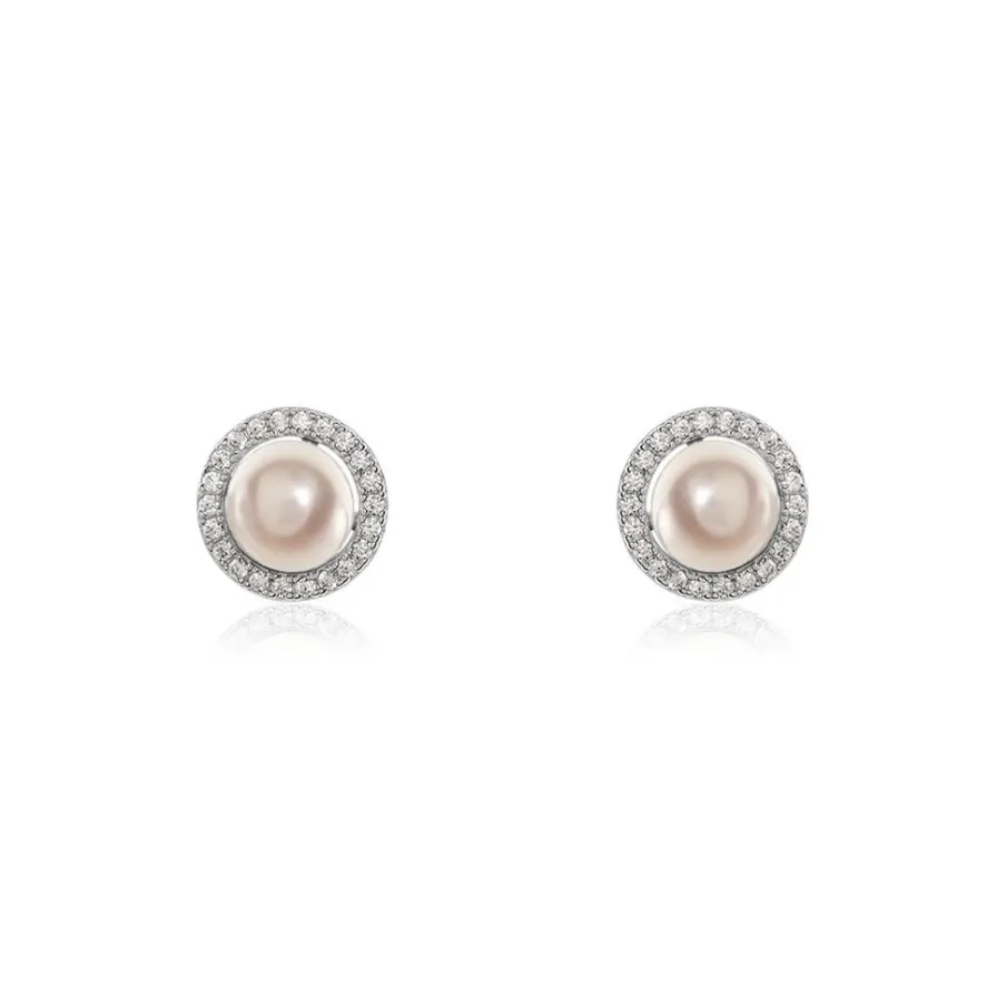 Boucles D’oreilles Puces Argent Blanc 925/1000 Perles De Culture 6mm Entourage Oxydes De Zirconium