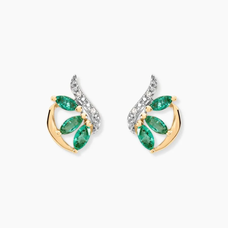 Boucles D’oreilles Puces Or Jaune 375/1000 Emeraude Marquise Serti Griffes 0.42ct Et Diamants