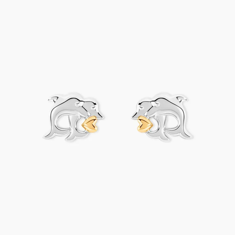 Boucles D’Oreilles Puces Or Jaune 375/1000 Et Argent Blanc 925/1000 Dauphin Et C艙ur
