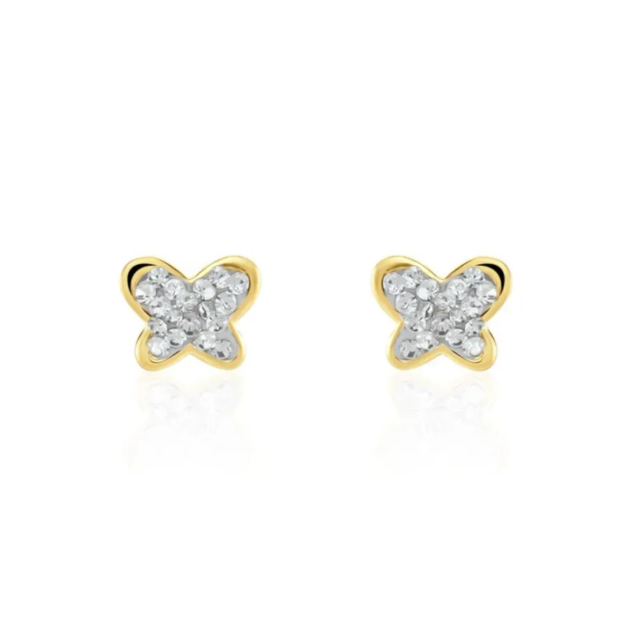 Boucles D’oreilles Puces Or Jaune 750/1000 Papillons Strass Fermoirs Vis