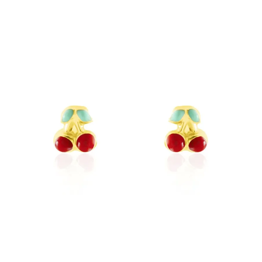 Boucles D’oreilles Puces Or Jaune 375/1000 Cerises Email Rouge Fermoirs Vis