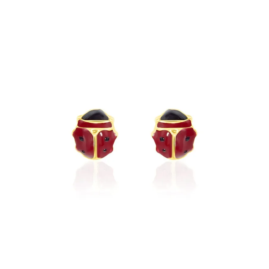 Boucles D’oreilles Puces Or Jaune 375/1000 Coccinelles Email Rouge Fermoirs Vis