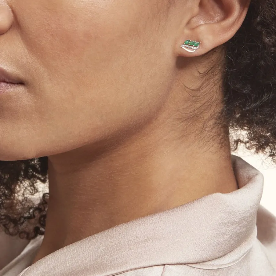 Boucles D’oreilles Puces Or Jaune 375/1000 Trilogie Emeraudes Navette Accompagnées Diamants