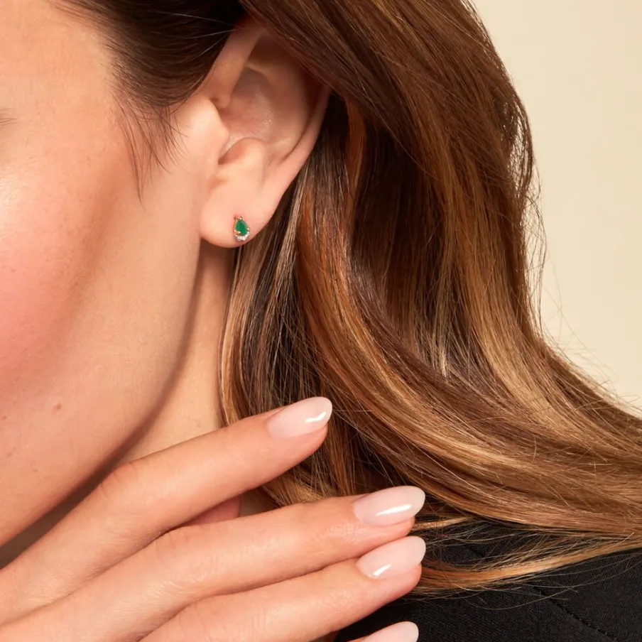 Boucles D’oreilles Puces Or Jaune 375/1000 Forme Poire Emeraude 0.208cts Serti Griffes Et Pavage Diamants 0.004cts