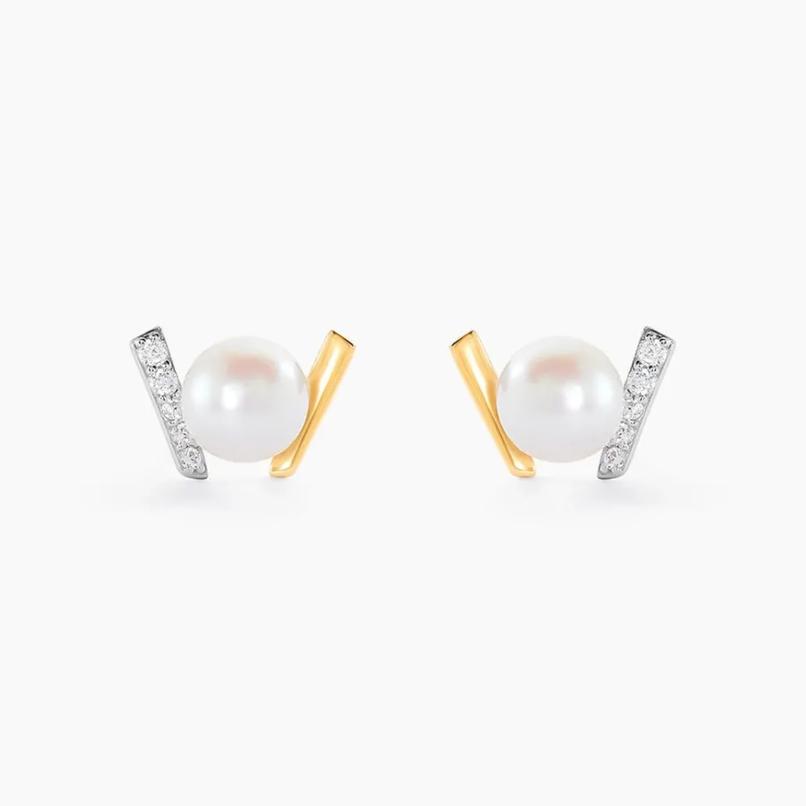Boucles D’oreilles Puces Or Jaune 375/1000 Perle De Culture Blanche Et Barre Pavage Oxydes De Zirconium
