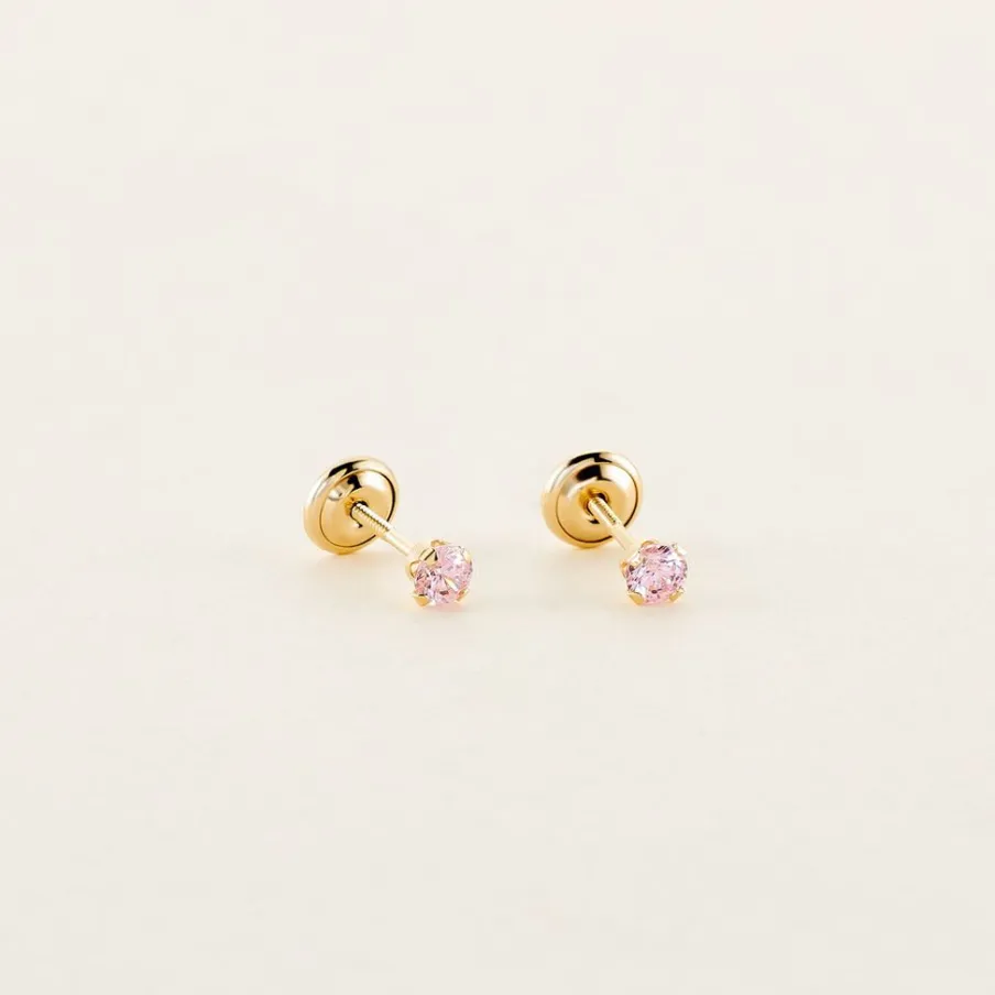 Boucles D’oreilles Puces Or Jaune 750/1000 Oxydes De Zirconium Roses Forme Ronde Serti 4 Griffes 3mm Fermoirs Vis