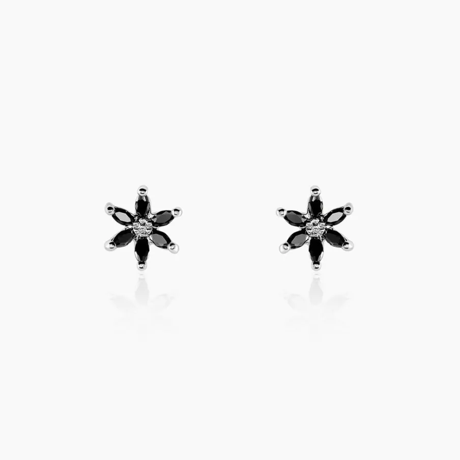 Boucles D’oreilles Puces Argent Blanc 925/1000 Fleurs Oxydes De Zirconium Noirs