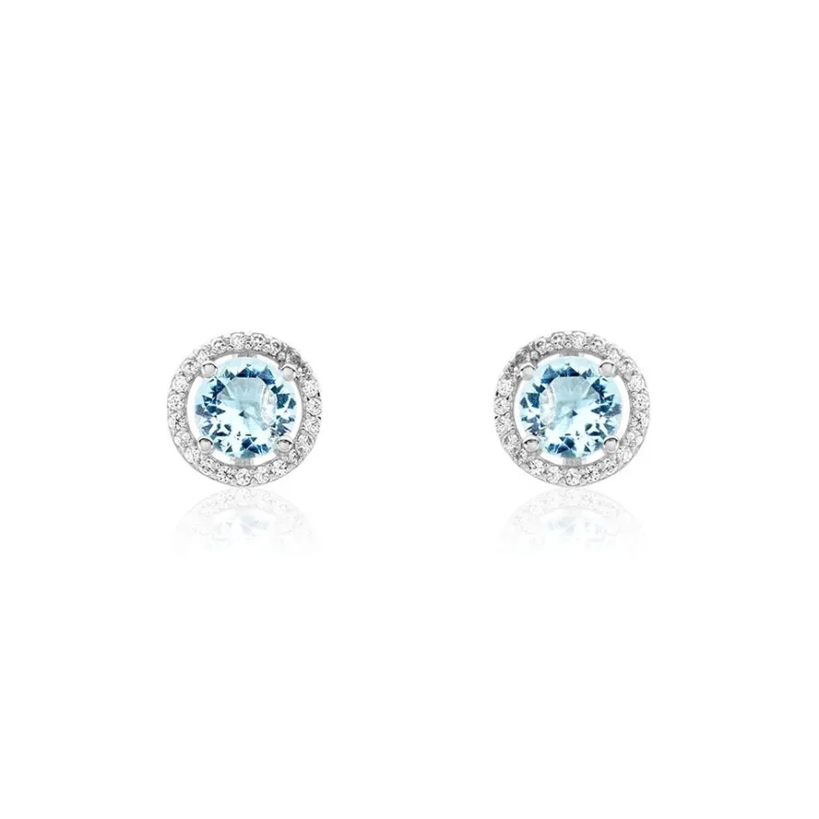 Boucles D’oreilles Puces Argent Blanc 925/1000 Oxydes De Zirconium Bleu Azur Entourage Oxydes Sertis Griffes
