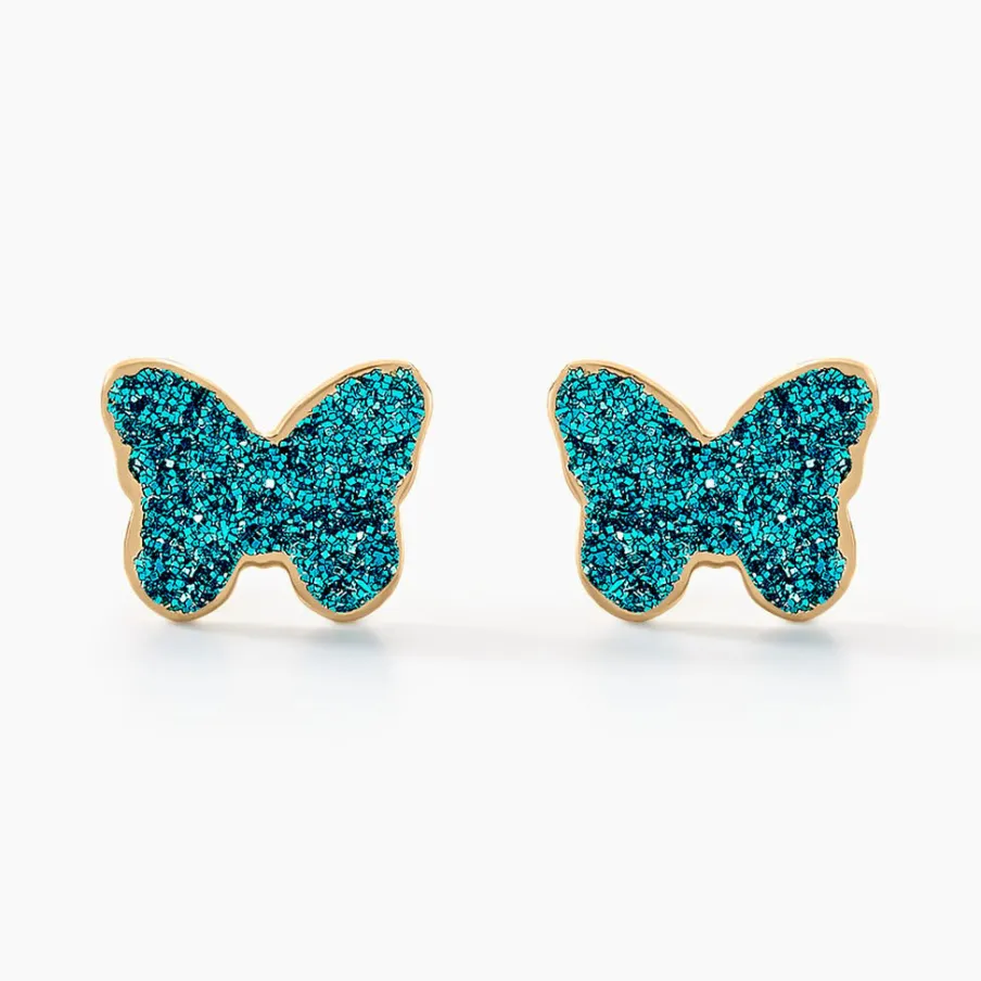 Boucles D’oreilles Or Jaune 375/1000 Puces Papillons Glitter Bleus