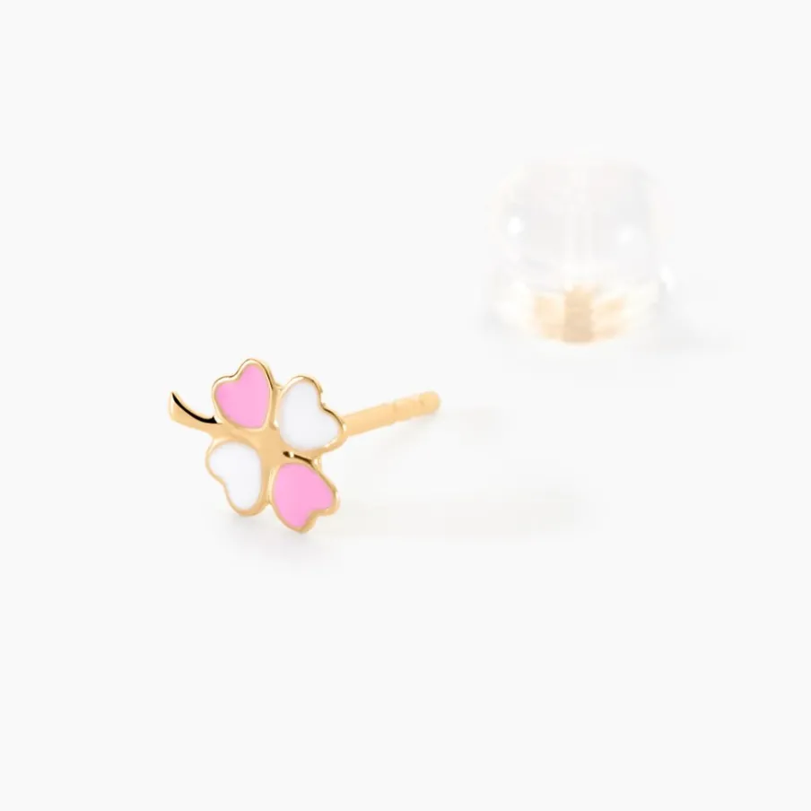 Boucles D’oreilles Or Jaune 375/1000 Trèfle Email Rose Et Blanc