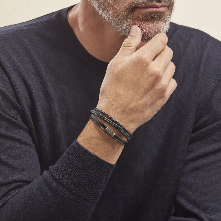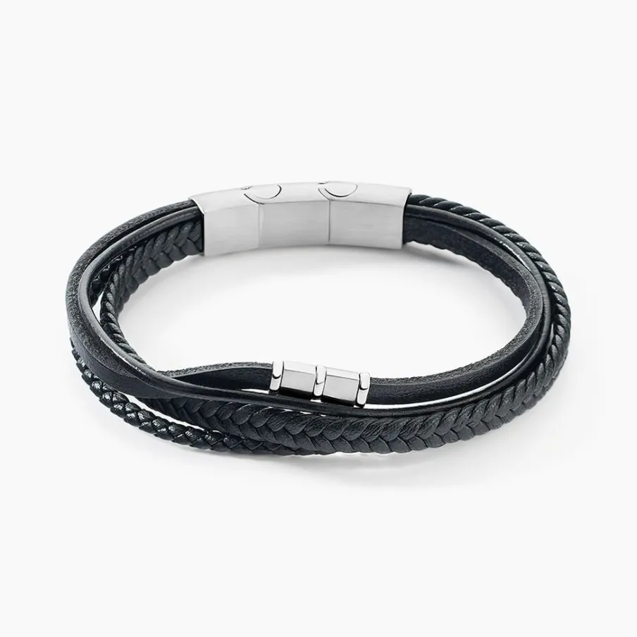 Bracelet Acier Inoxydable Blanc Multi Bracelets Tressé Cuir De Vache Noir Et Synthetique Noir 21cm