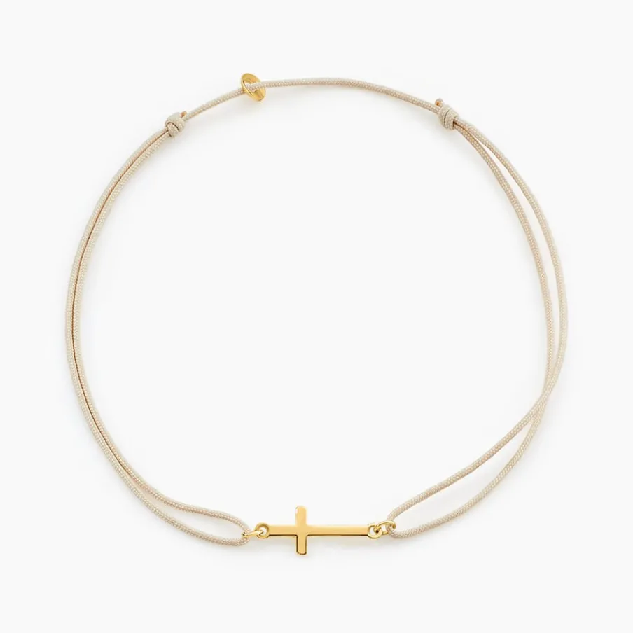 Bracelet Or Jaune 375/1000 Croix Sur Cordon Nylon Ajustable Beige