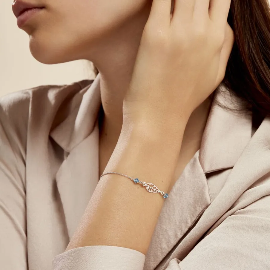 Bracelet Argent Blanc 925/1000 Feuille Pierres Bleues Maille Forcat 18.5cm