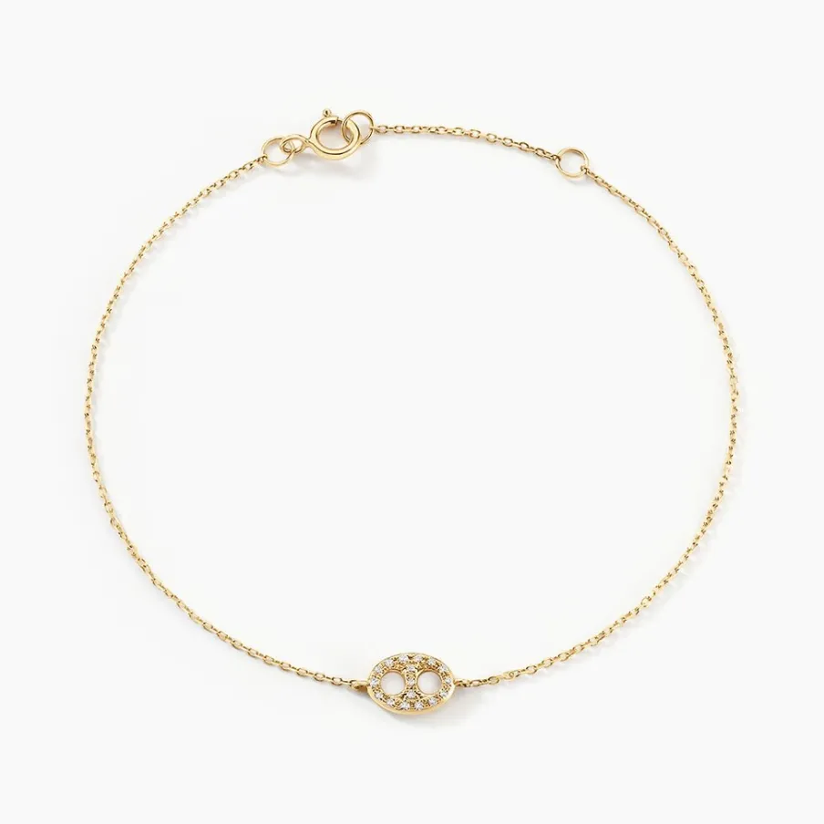 Bracelet Or Jaune 375/1000 Grain De Cafe Pavage Diamants Maille Forcat 16+2cm