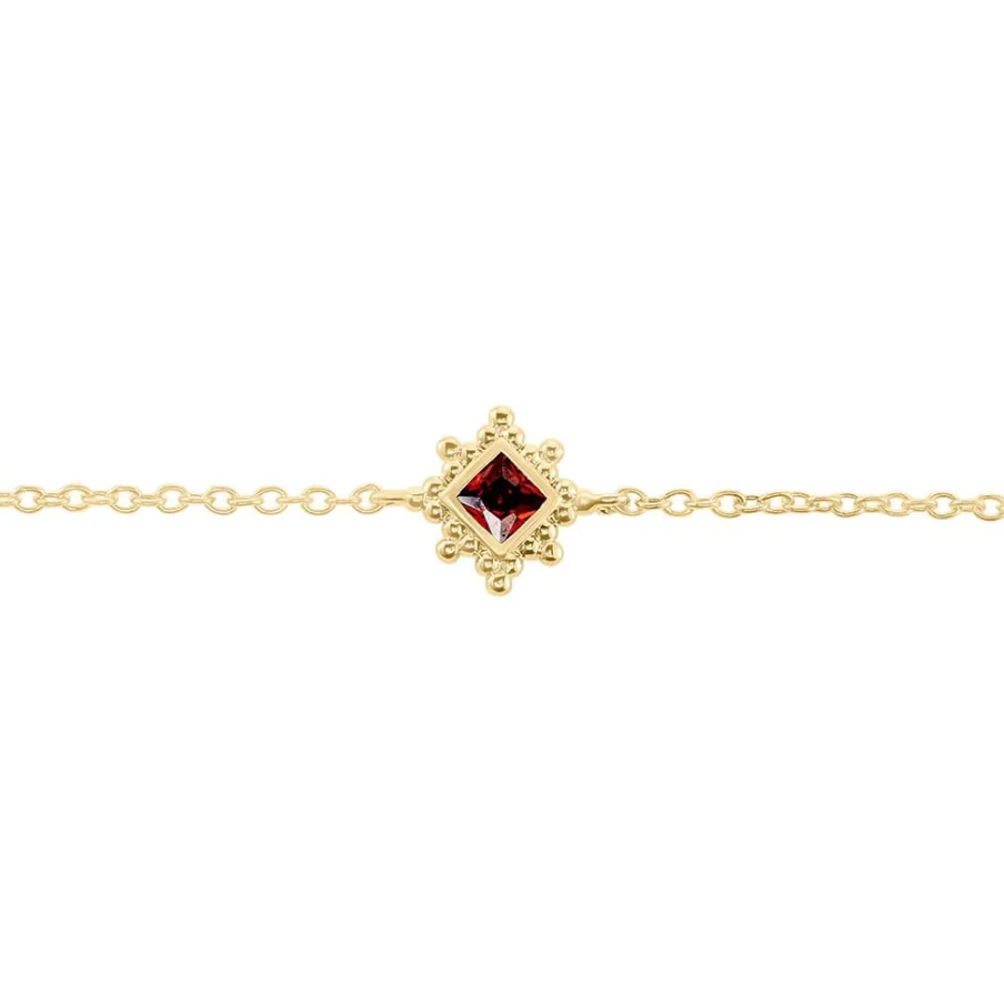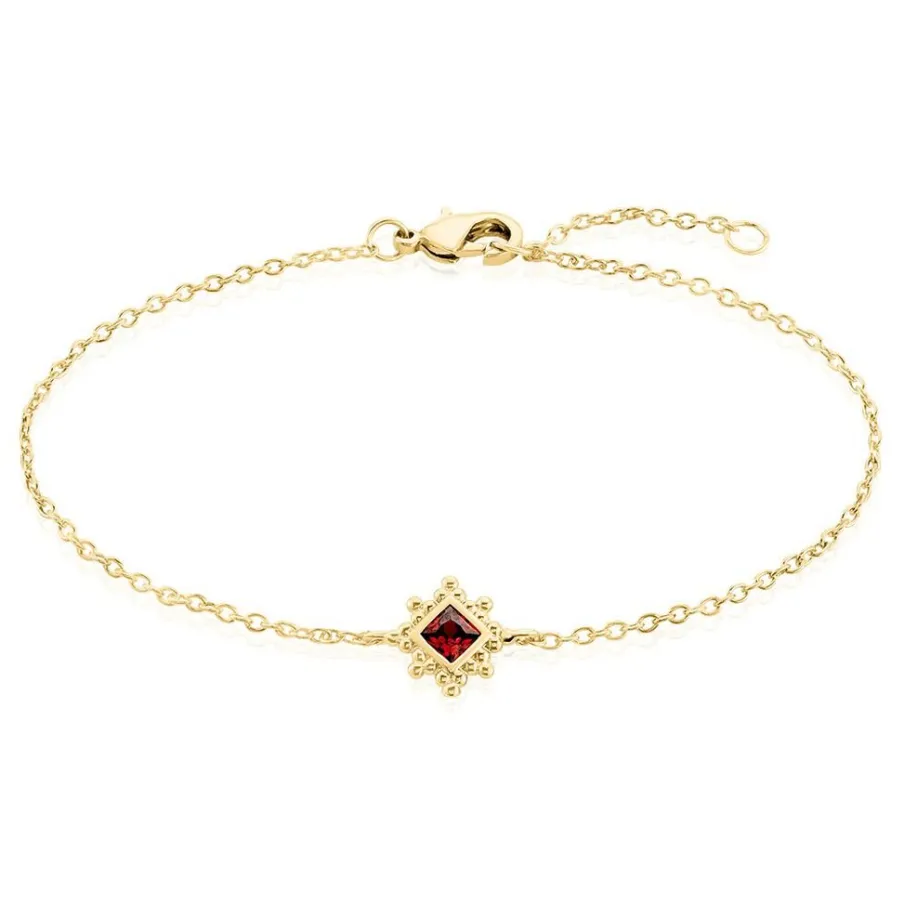 Bracelet Plaqué Or Jaune Losange Oxyde De Zirconium Rouge Entourage Perlé Maille Forçat 18cm