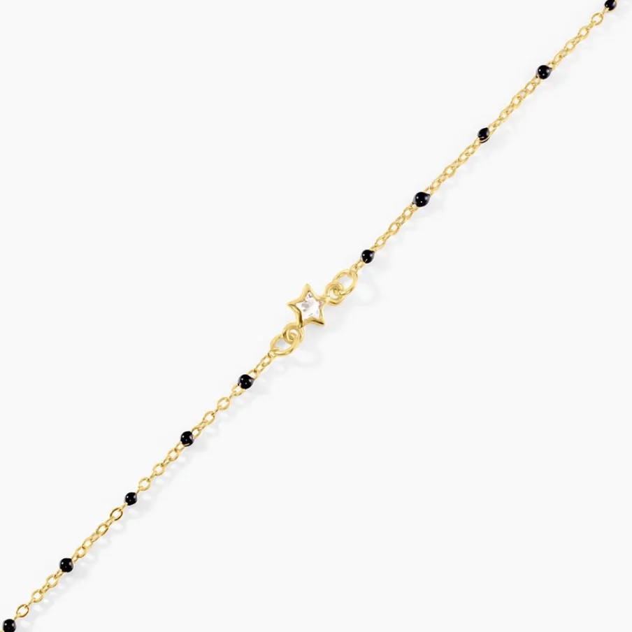 Bracelet Court Argent Jaune 925/1000 Étoile Oxyde De Zirconium Serti Clos Boules Email Noir Maille Forcat 14+2Cm