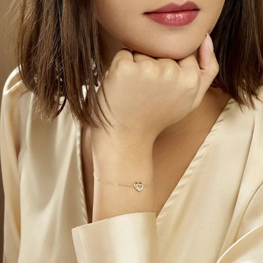 Bracelet Or Jaune 375/1000 Double C艙urs Pavage Oxydes De Zirconium 18cm