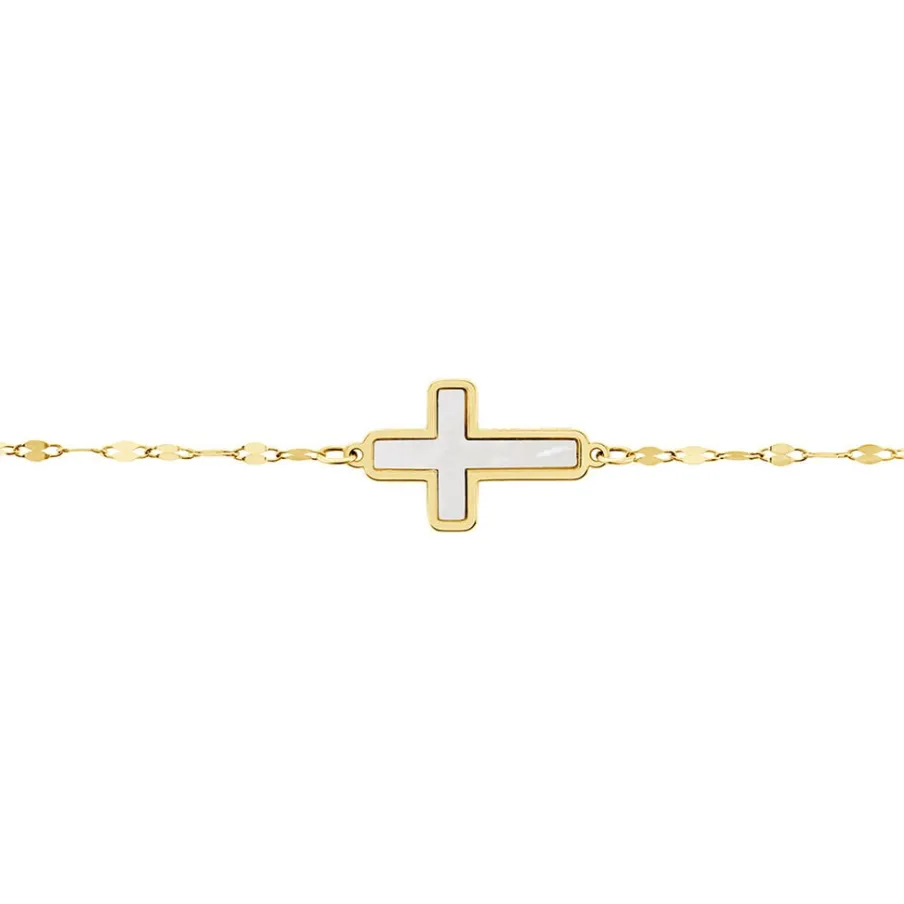 Bracelet Or Jaune 375/1000 Croix Nacre Blanche Maille Lumina 16+2cm